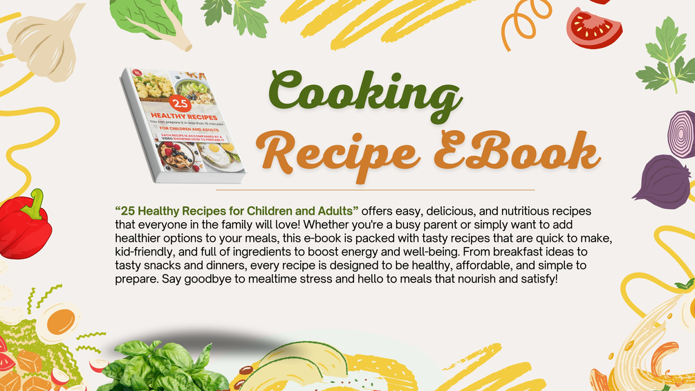 “25 Healthy Recipes for Children and Adults” offers easy, delicious, and nutritious recipes that everyone in the family will love! Whether you're a busy parent or simply want to add healthier options to your meals, this e-book is packed with tasty recipes that are quick to make, kid-friendly, and full of ingredients to boost energy and well-being. From breakfast ideas to tasty snacks and dinners, every recipe is designed to be healthy, affordable, and simple to prepare. Say goodbye to mealtime stress and hello to meals that nourish and satisfy!